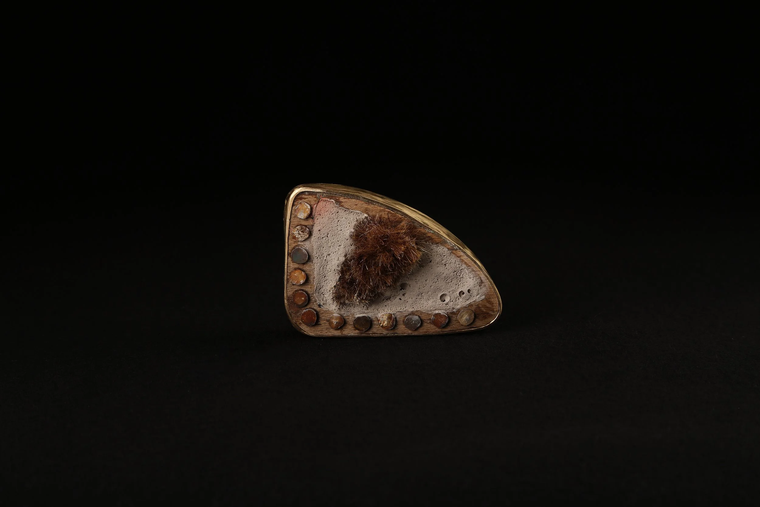 concrete; wood; animal fur (naturally shedded); p.v.p.; silver; brass; steel; dried plants; foam
