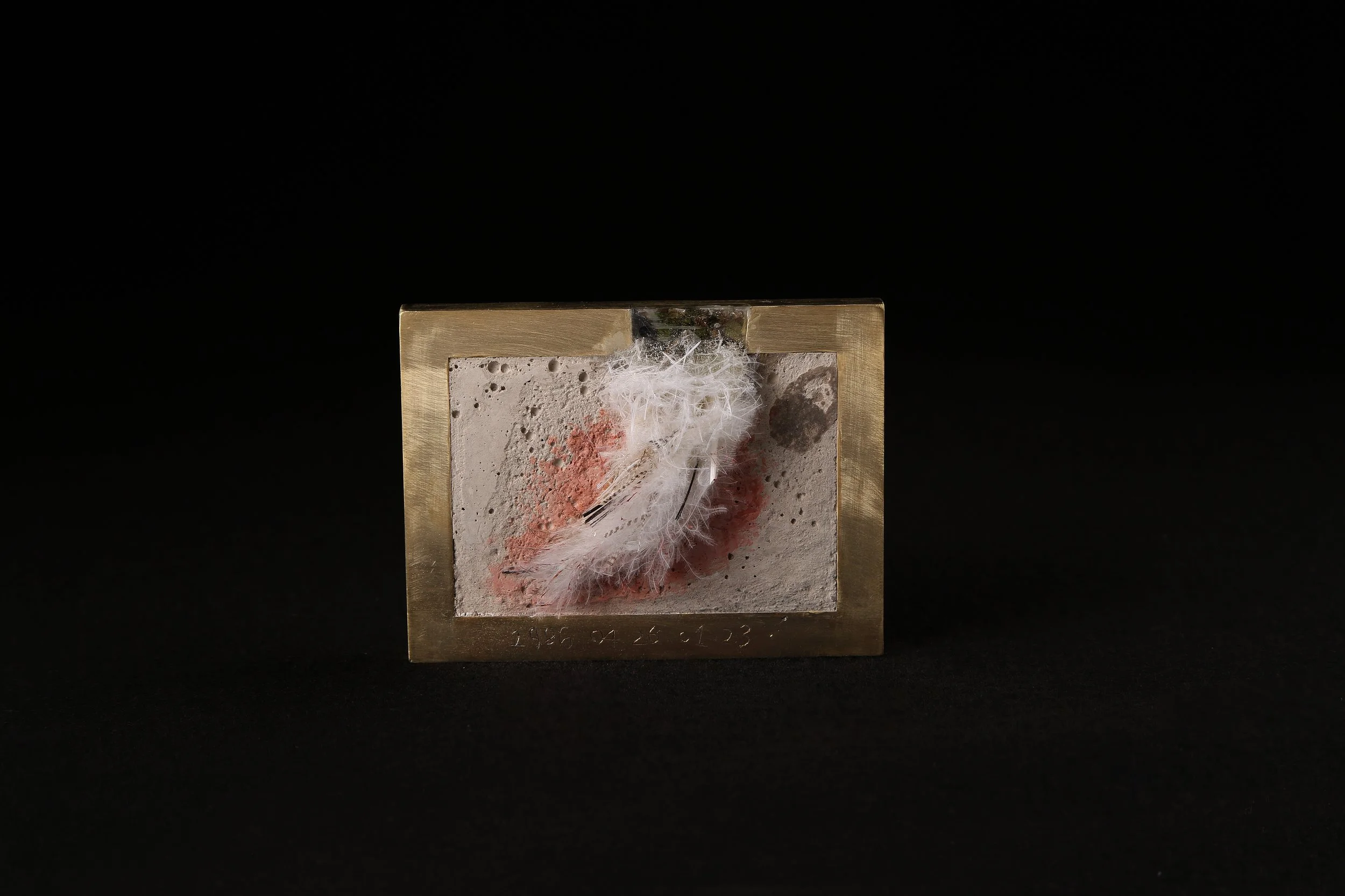 concrete; brass; dried leaves and flowers; animal fur and feathers (naturally shedded); readymade choker; foam